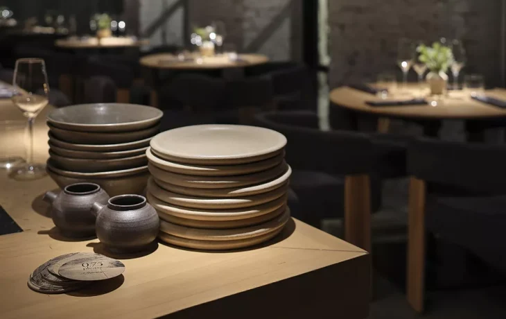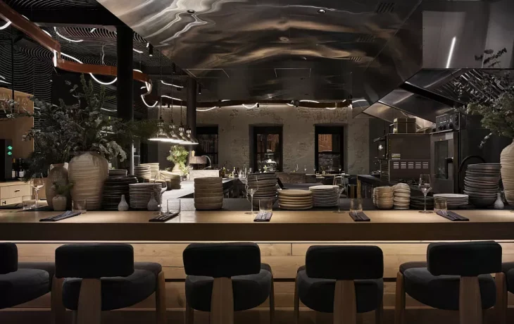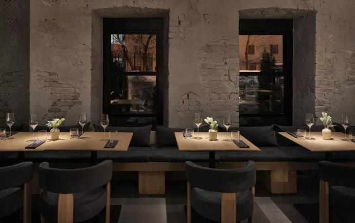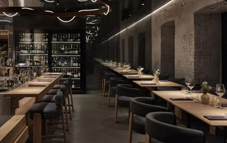 Камерный на 44 места ресторан, выстроенный вокруг кухни, сохранил эстетику старшего брата, соединив скандинавский минимализм с локальной аутентичностью. Старая кирпичная кладка, дерево, металл, потолок, в линиях которого словно застыли порывы ветра. Открытая кухня, 3 метра на 2, как сцена в центре зала, окруженная «зрительскими» местами.